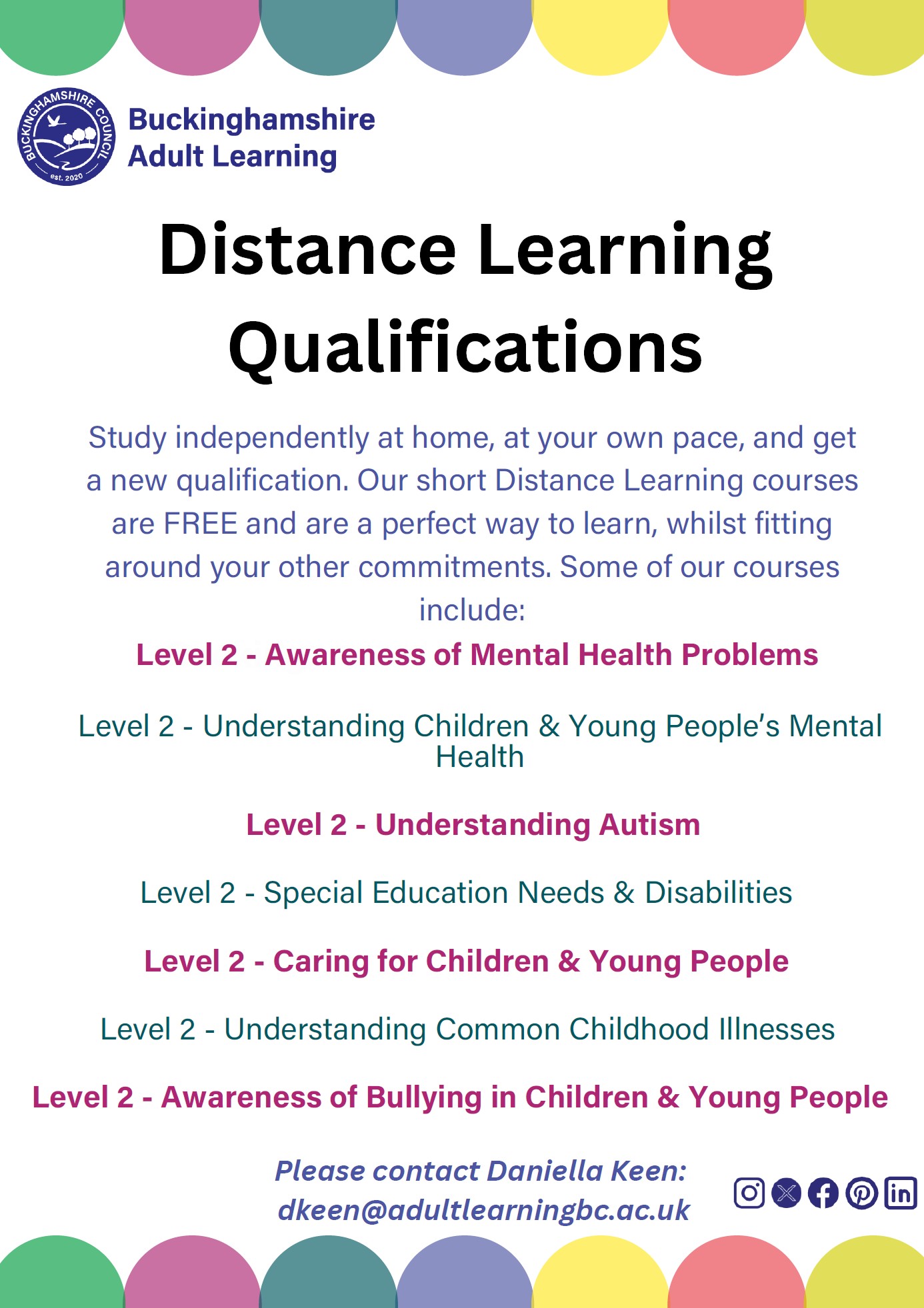 Please refer to the pictures below for full details of the courses currently available. All courses are free of charge. Enrolment can be completed via the QR codes provided below or by calling the telephone number.